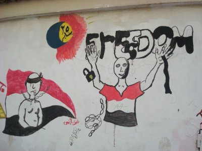 “I’m Egyptian / I’m Egyptian, Mother of the World / With the passing of time / Peace and love in each person’s hands.” It’s signed, “25 January: the beginning of Egyptian freedom” |