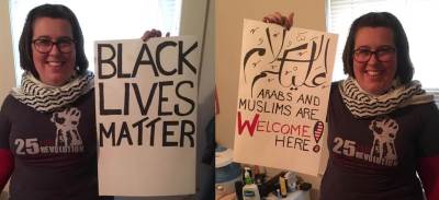 There was a great diversity of signage there, too. Some of it was ad hoc, “no ban, no wall” scrawled inside the cover of a Krispie Kreme box. Others were pre-made, “No Hate, No Fear, Immigrants are Welcome Here,” or Shepard Fairey’s woman in an American flag hijab drawn for Saturday’s Women’s March. There were also beautiful handmade signs of “I [heart] [woman in hijab]” and “[woman in hijab] welcome here.” And just like the speakers’ words, there were a lot of signs pointing to intersectional identities. This next image is hard to read, but those signs say, “Black / Sudanese / Muslim / Womxn / Try Me!” and “Sudanese / Muslim / Refugee / Arab / Feminist / Black / Womxn” and “Black / Sudanese / Muslim / Womxn / Immigrant / Unapologetic.”
