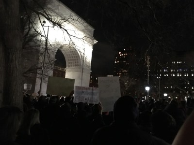 More than 3,000 people attended last night; 8,800 from across the country say they “went” via the Facebook group, and 15,000 more say they were “interested.” These aren’t small numbers for a local rally put together with 12 hours notice. And not a single arrest was made in Washington Park, which says as much about the de Blasio era of policing in New York City as it does about the crowd. There were cops everywhere, on foot, no riot gear. Most of the cops I saw were just chatting amicably with passers-by.