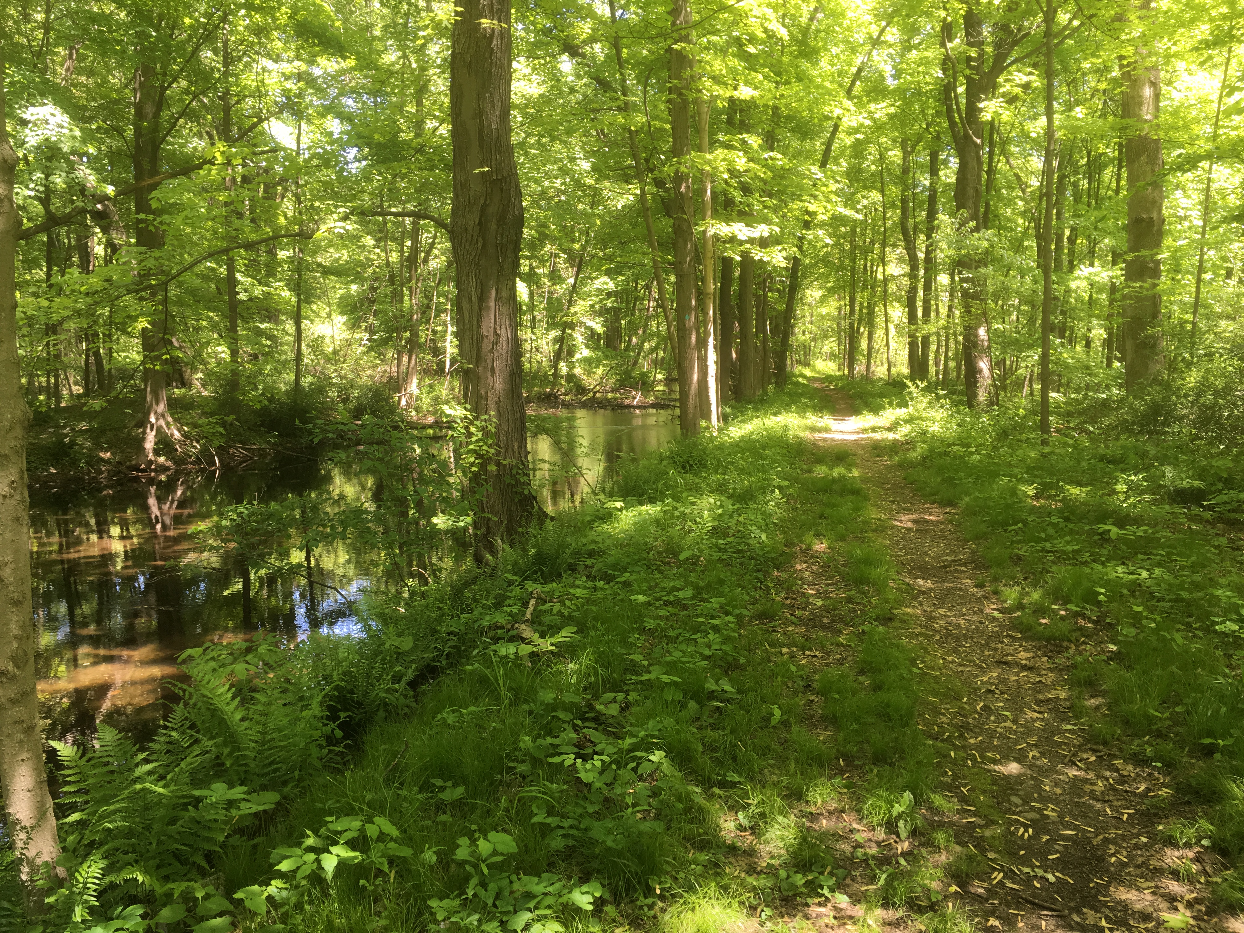 The trail runs along a low berm between a broad, winding creek and the Morris Canal, built in the 1830s, which for almost 100 years connected the Delaware River to the Hudson River, bringing the mineral wealth and coal of Pennsylvania’s Lehigh Valley to New Jersey industry and New York City. What’s now a recreational trail would have been the tow path walked by the mules who dragged the barges down the canal, with the occasional drainage canal running beneath a wooden footbridge.