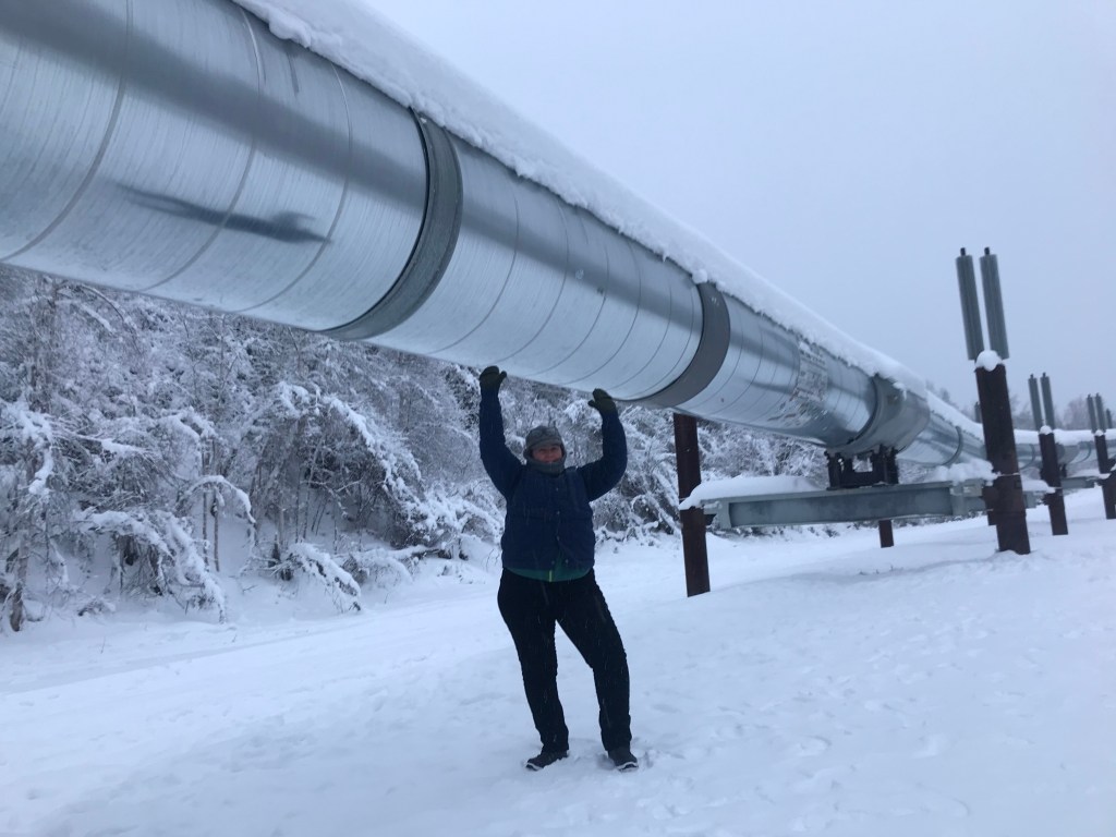 Dry cabin culture and Fairbanks itself exist mostly because of two things: gold mining and the pipeline. (There are many oil pipelines, but like The River in York County, The Pipeline only means one thing in Alaska.) So after checking out the dry cabin neighborhood where he was born, we headed farther out into the valley to see The Pipeline itself.