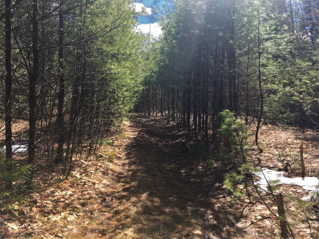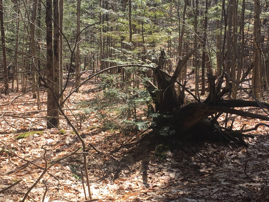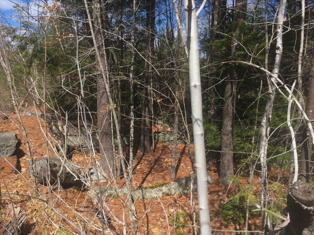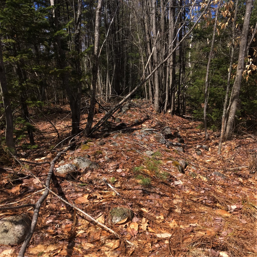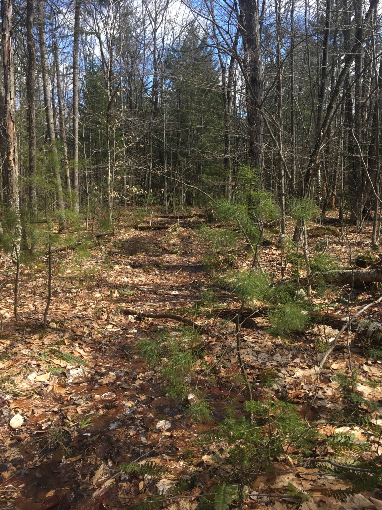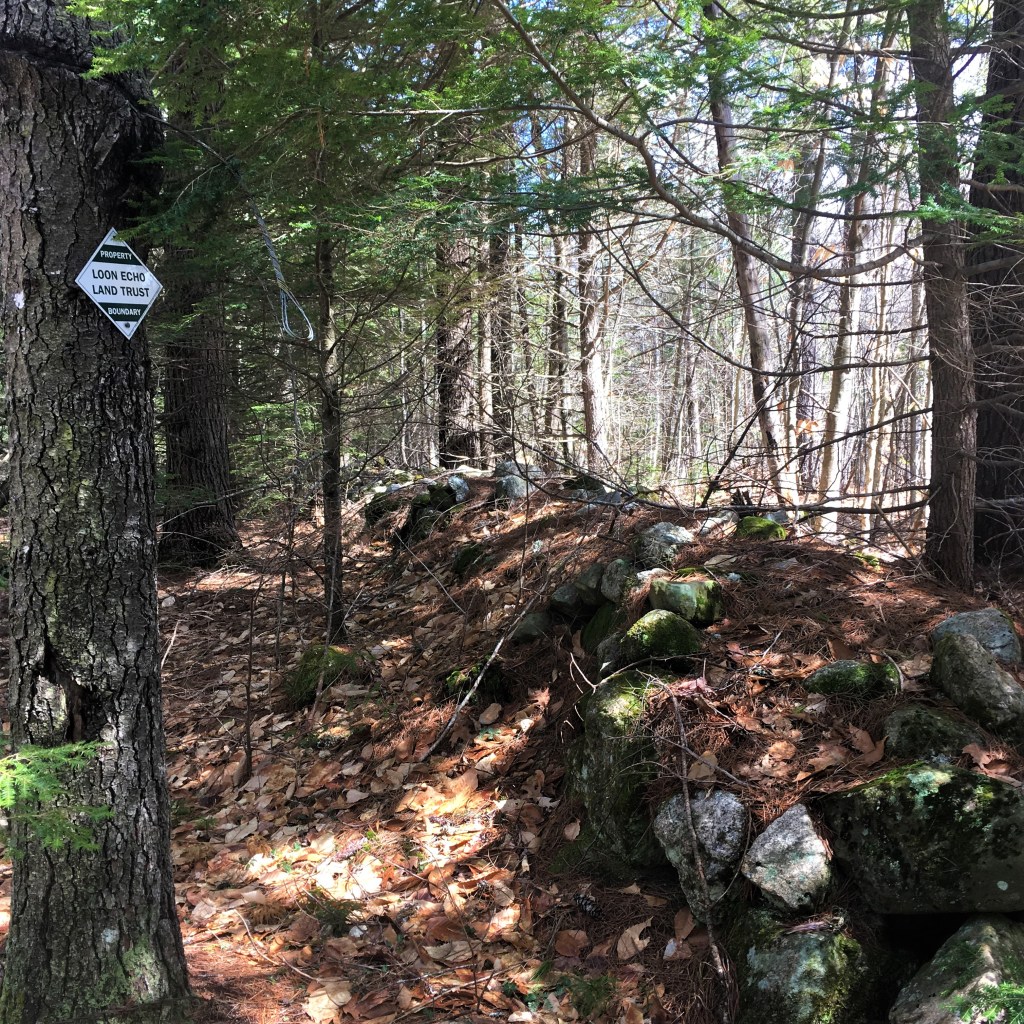 After this narrower, more evergreen section of the trail, we came to a rock wall that apparently marks the end of the Loon Echo Land Trust parcel, and the trail abruptly opened up to what seems to be a logging road, judging by evidence of cut stumps, plus how straight and uniformly young the trees are in distinct groves in this section.