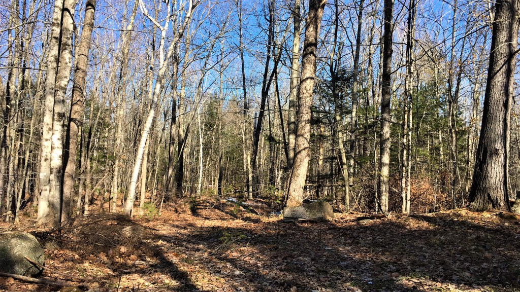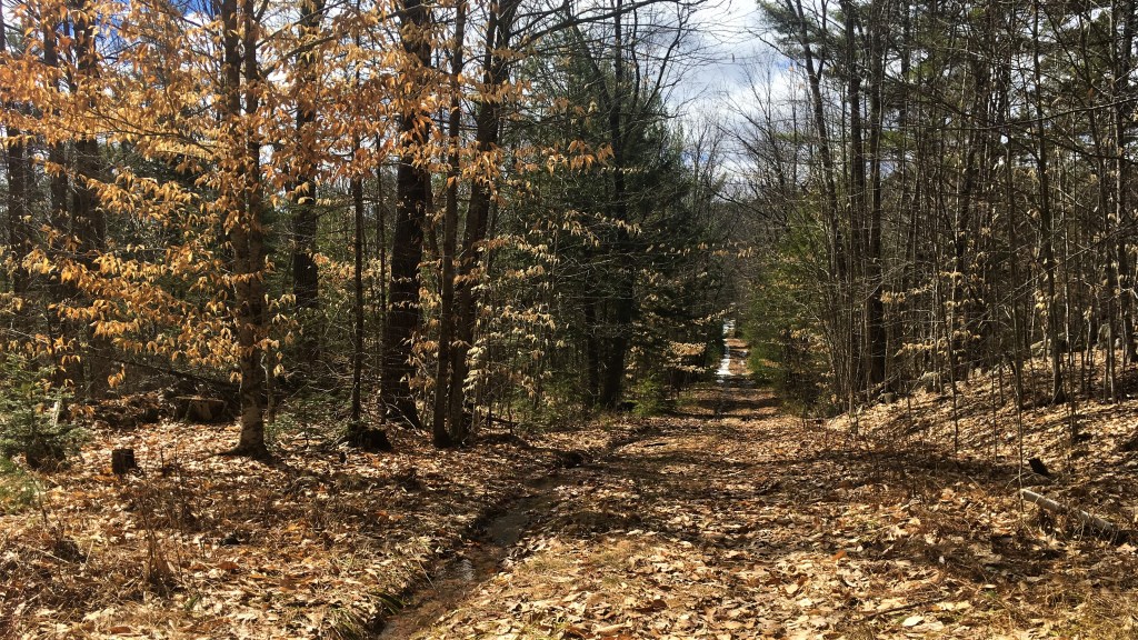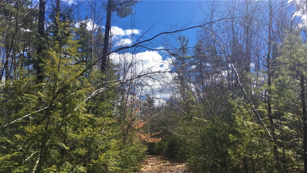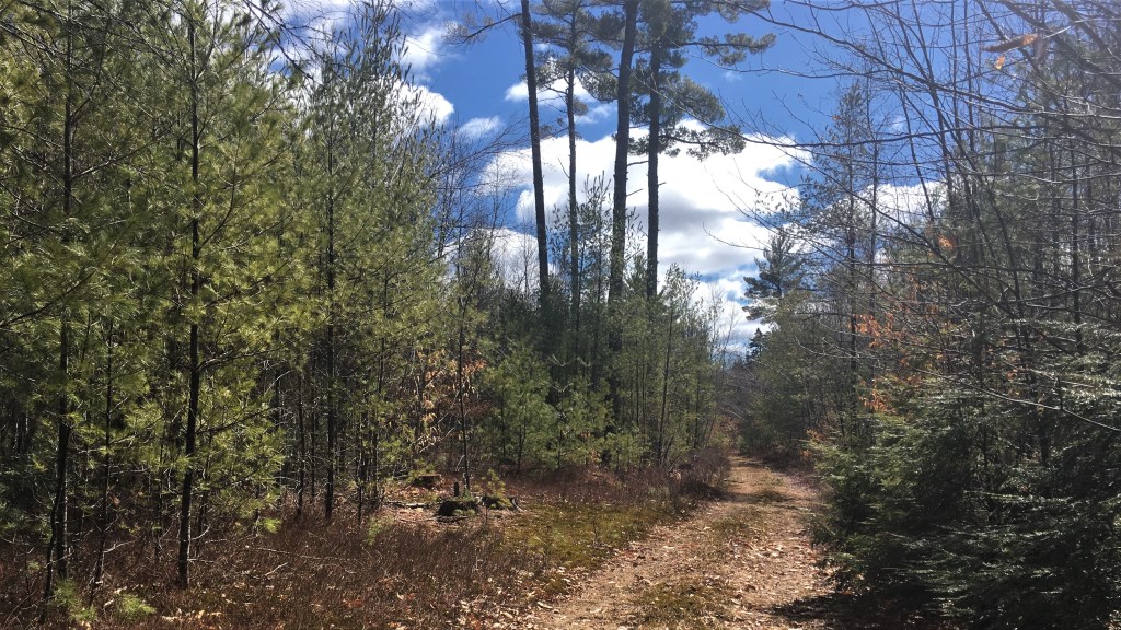 By this time, we had decided that we weren’t all that excited about tromping back through the woods and bushwhacking around the pools of runoff. We had also determined that we weren’t really up for going all the way down and around Holt Pond, either. A quick consultation with my AllTrails app showed another road cutting across the logging road we were on, cutting the corner up to Fosterville Road, which I know rather well.