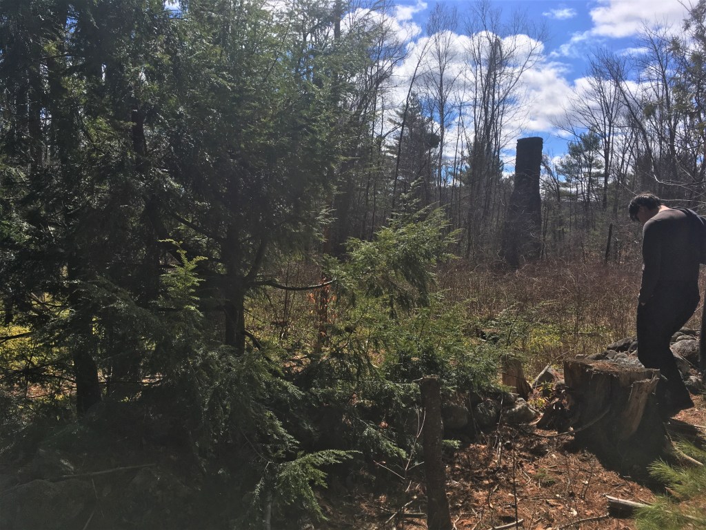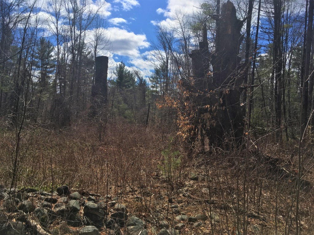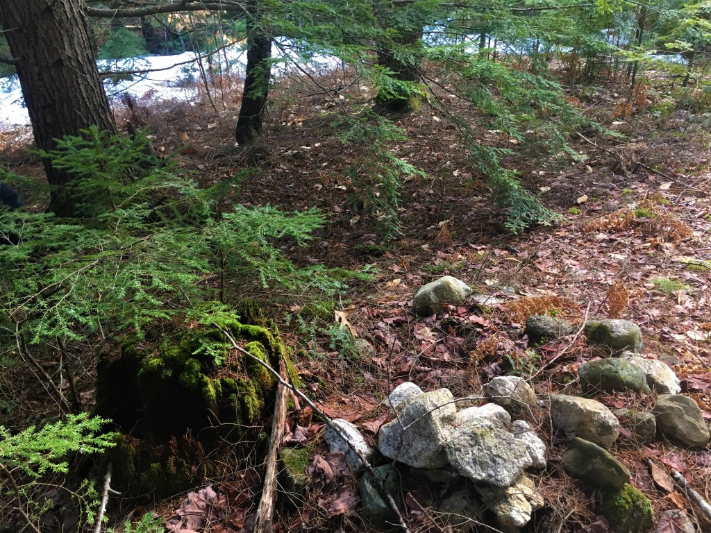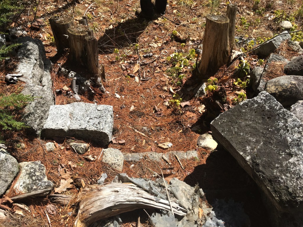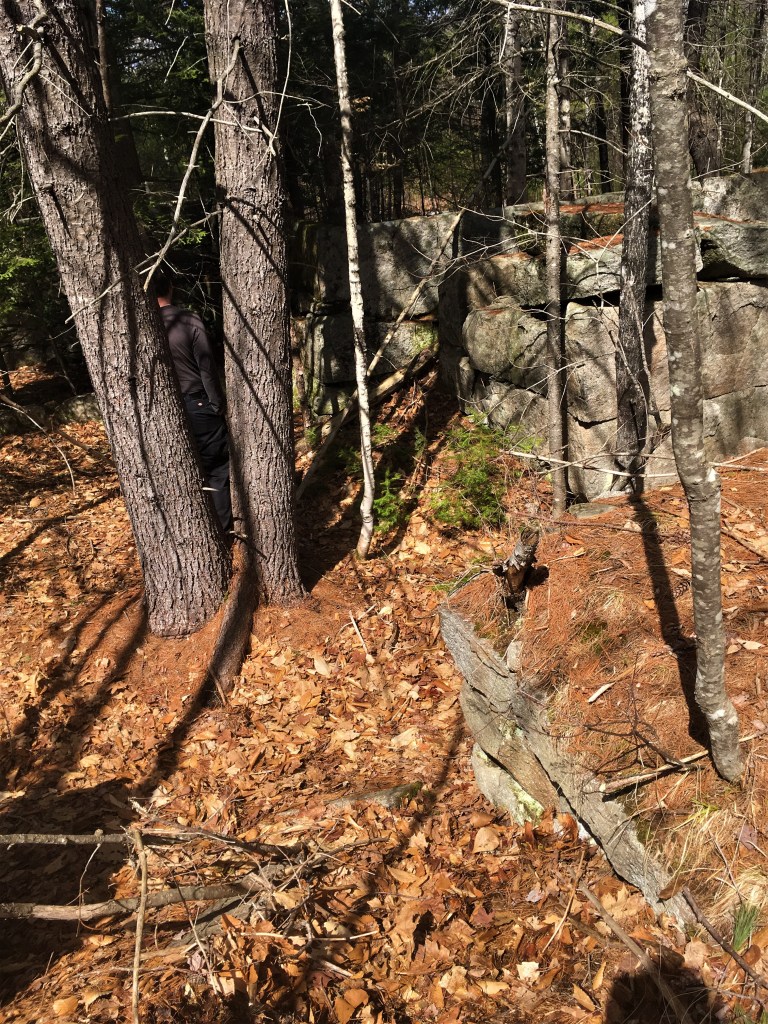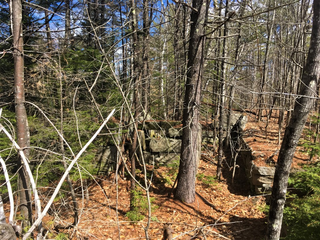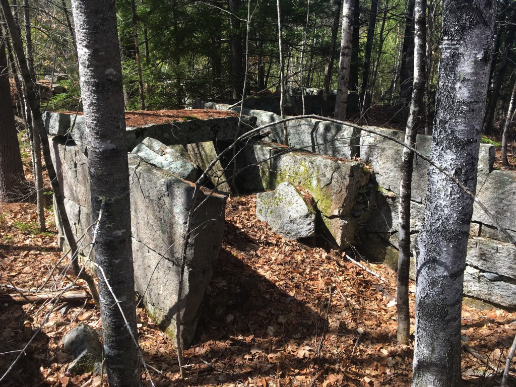 There’s a pretty massive set of granite foundations back in the woods, not far beyond where the Loon Echo land meets the logging road, hemmed in by little rock walls as if demarcating a dooryard. We wandered about a bit, wondering if perhaps it was a farmhouse complex or even the grain mill that is referenced in Gristmill Road where the logging road ends, but there’s not a lot left to tell the tale.