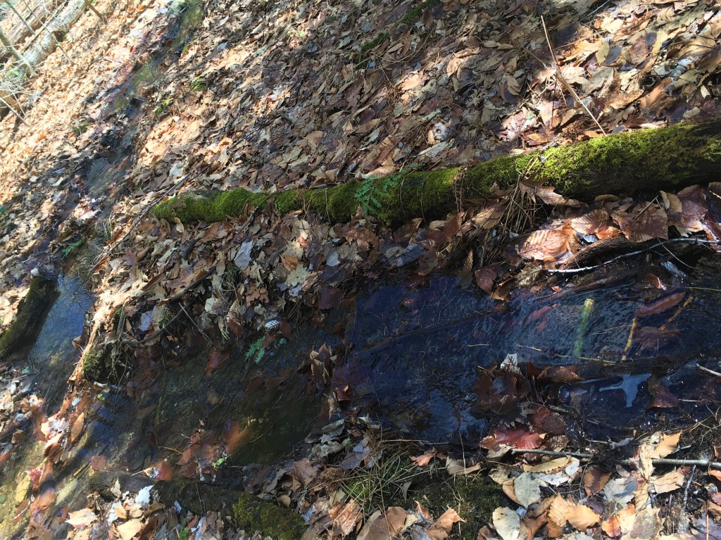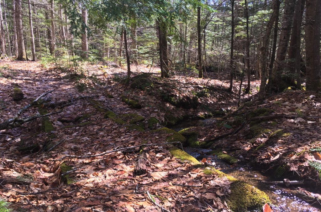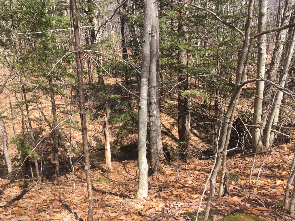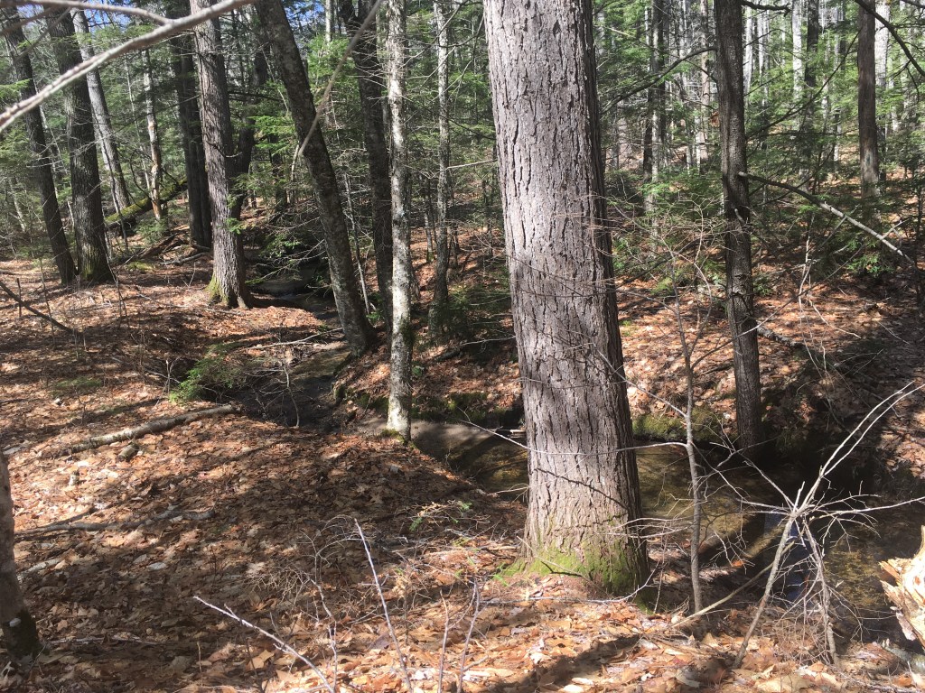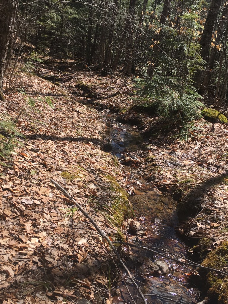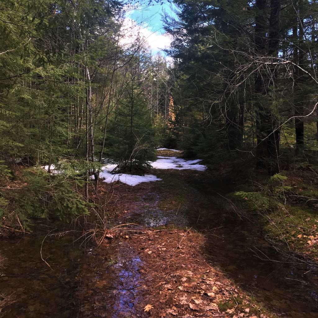 Maybe the marshiness of the first bits should have been a harbinger of things to come, but then it dried out quickly. My buddy was concerned that we might get lost coming back, but Mom had said to keep the stream to my left as we hiked out in the direction of Holt Pond, and just as we reached the edge of the embankment that dropped down to that stream, the path turned right and became quite clear.