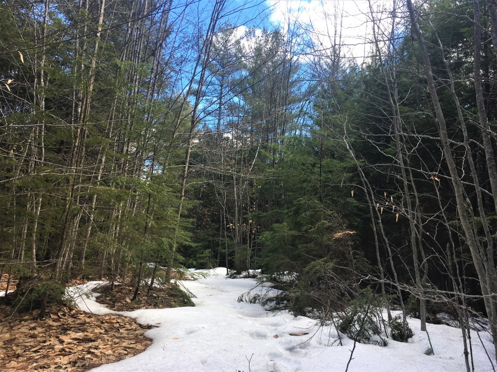 There were a few other places where snow and/or several inches of water covered the whole path; in the latter case, we found ourselves bushwhacking into the trees to one side or the other of the path for a bit.