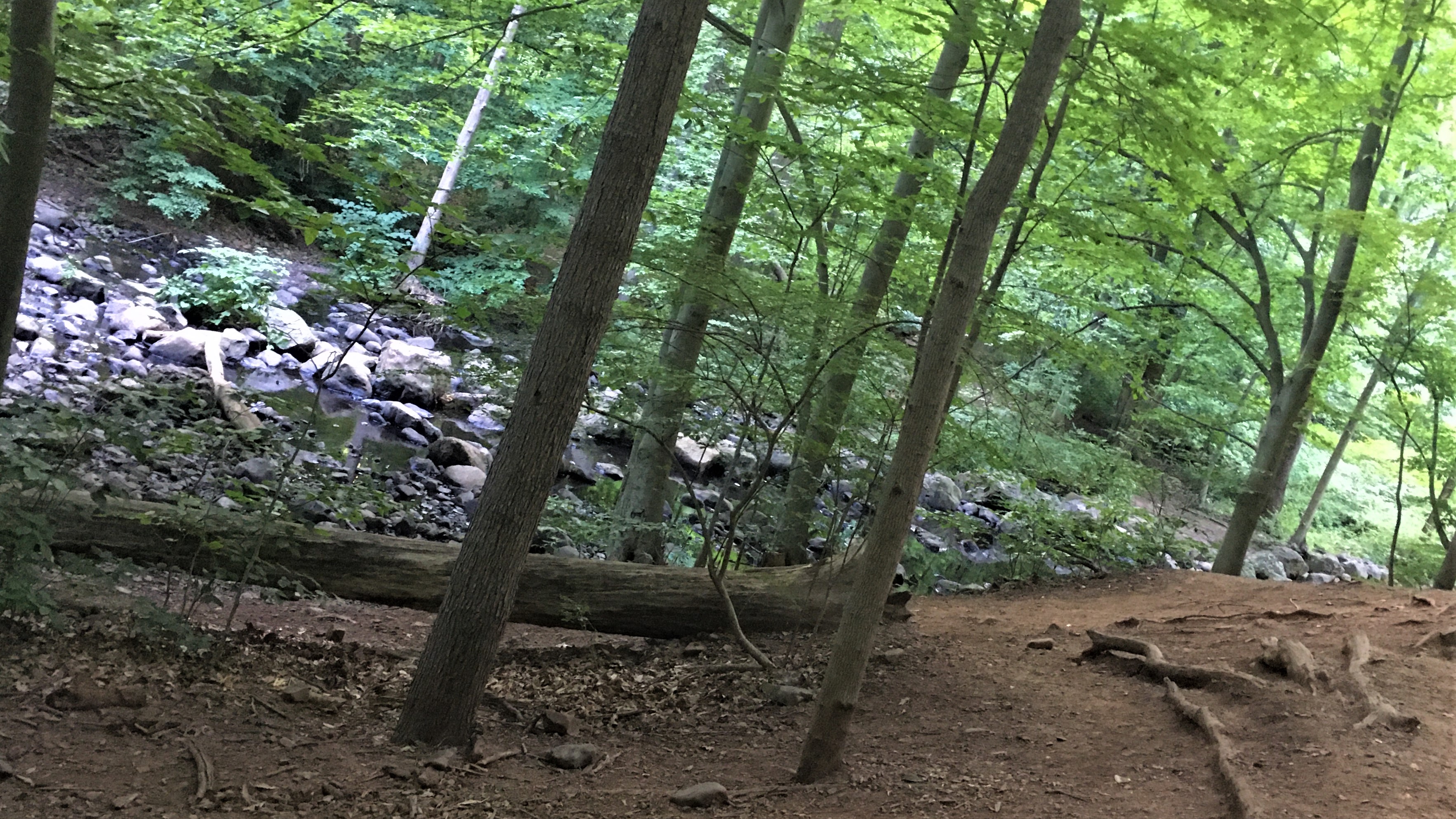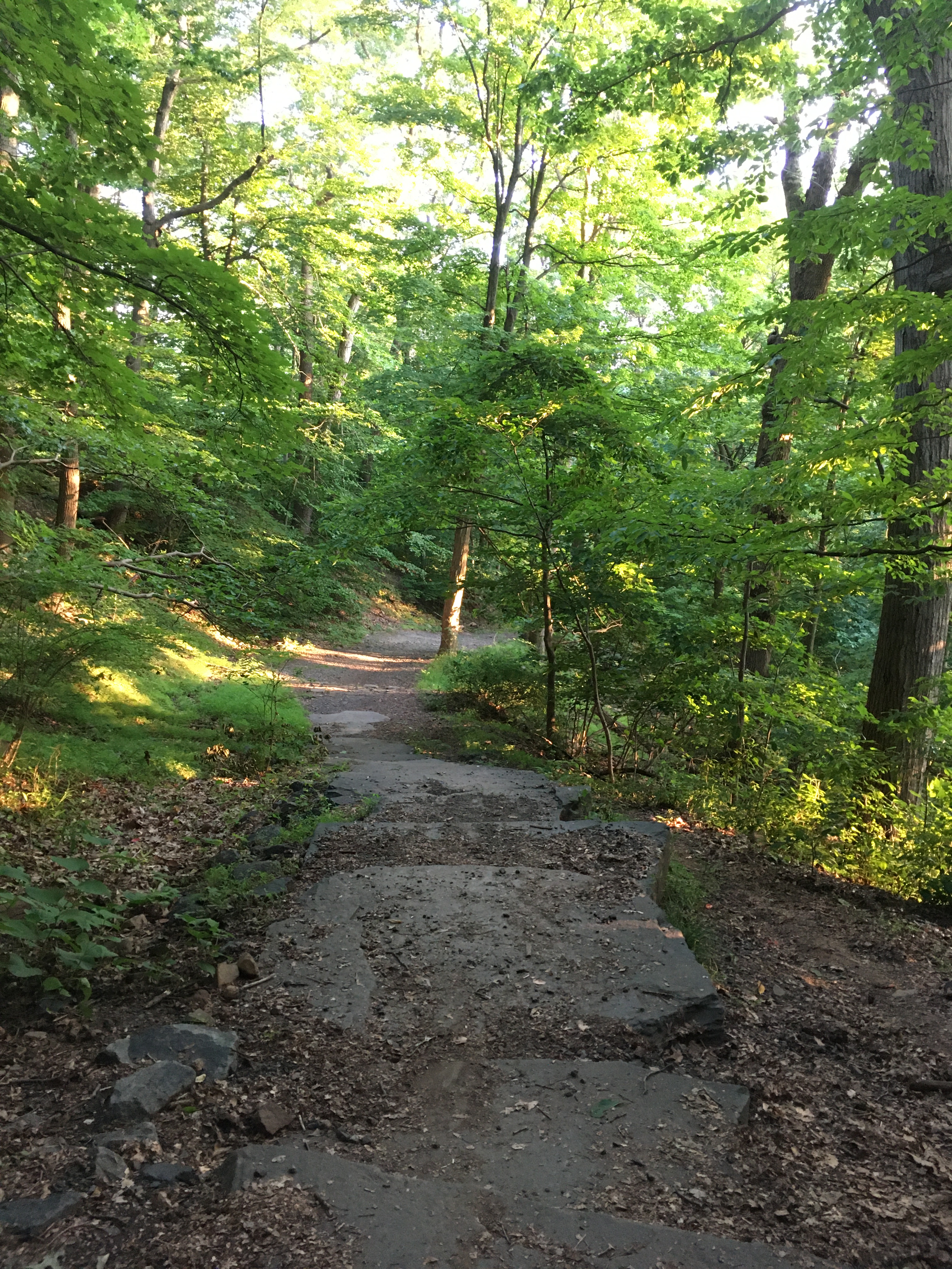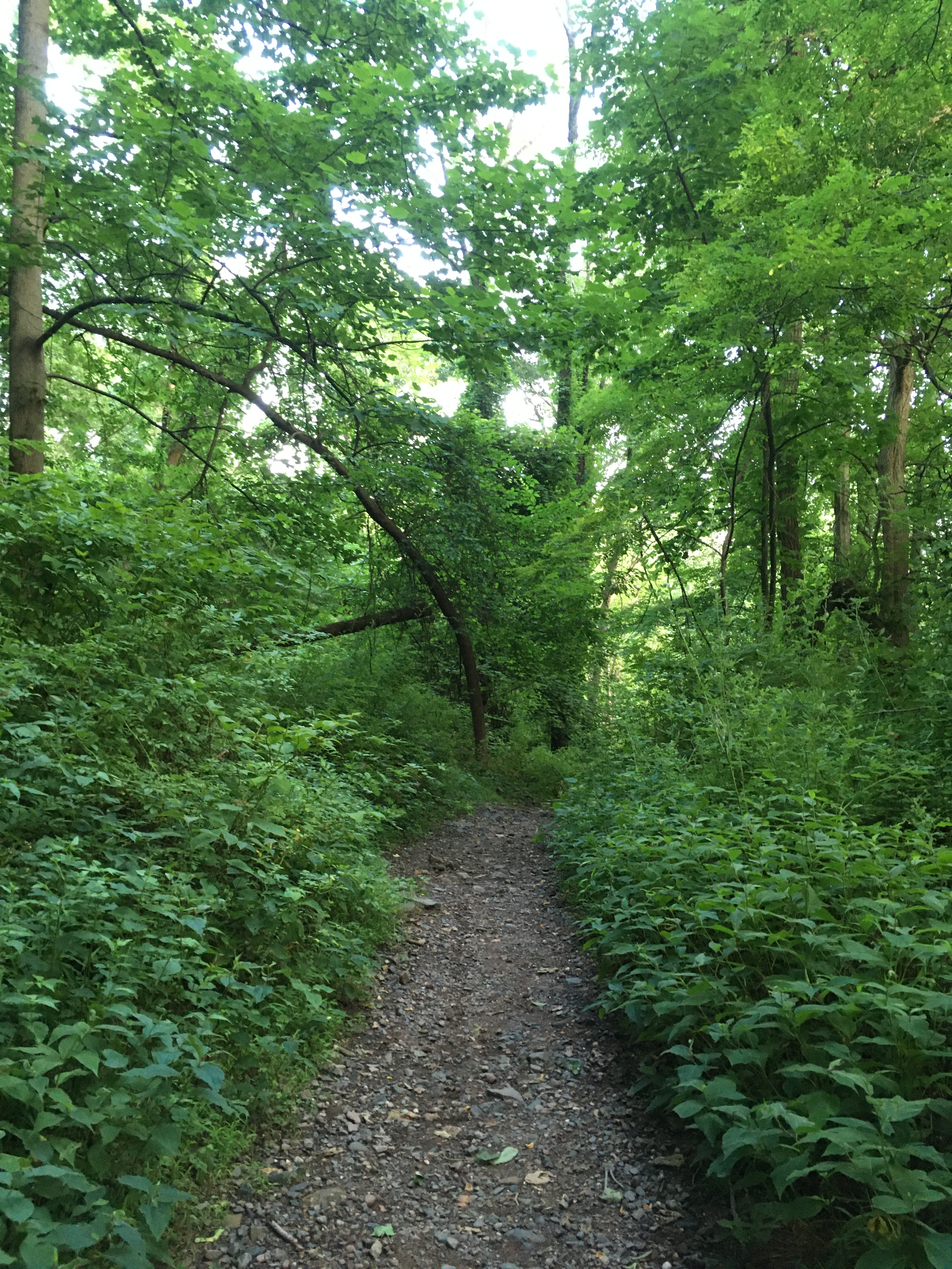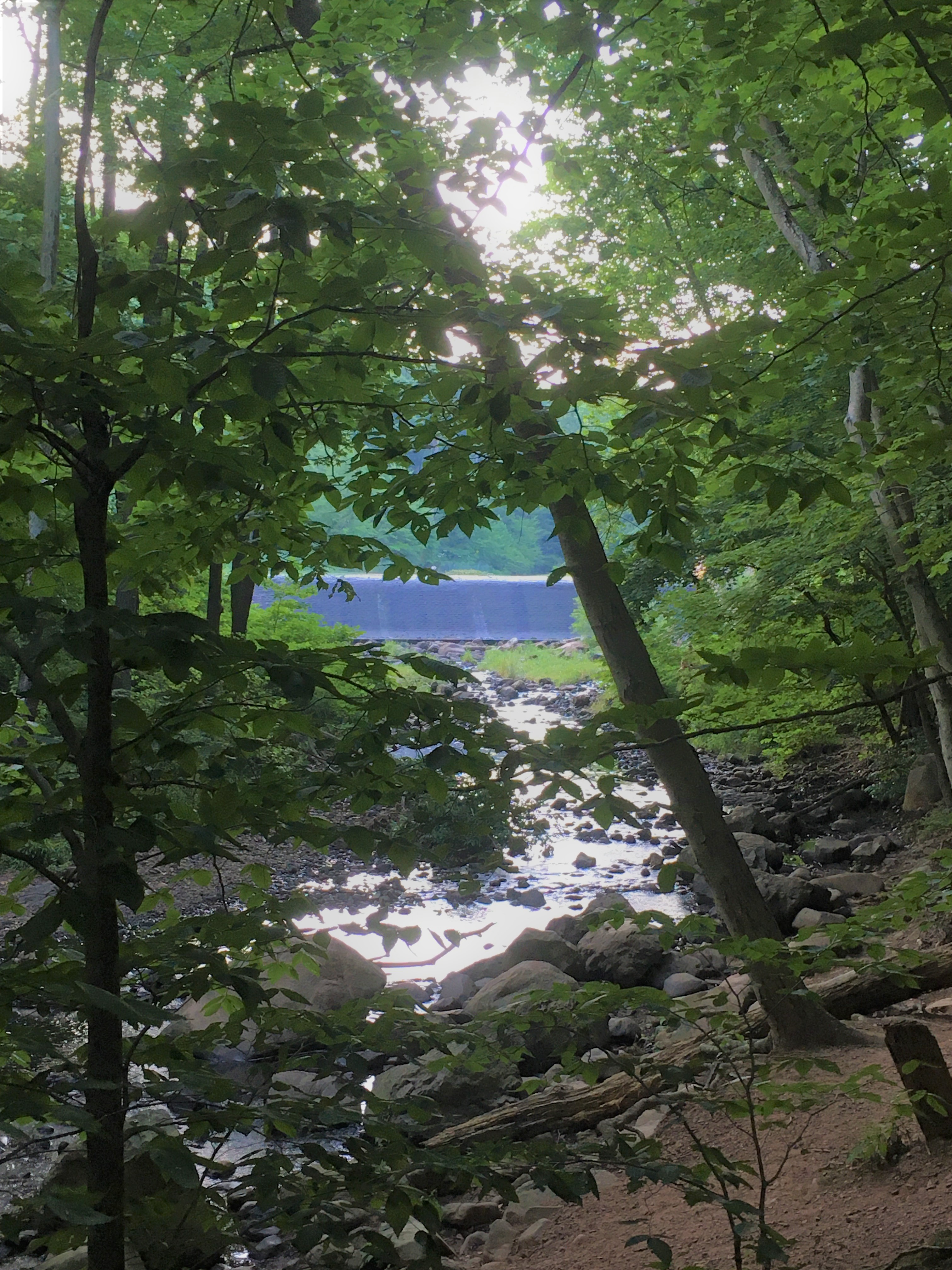 I was just looking for a short after-work walk in the woods in a heat advisory. I trawled about on my AllTrails app for awhile, and couldn’t find a flat hike of a length I felt like we could do on a day when I was feeling lazy and the heat was intense. I studied the dense network of trails at the Millburn end of South Mountain Reservation (again, actually a forest preserve — “The presence of the early Lenape Indians lingers [merely] in the name given to the Watchung—the “high hills.”), and decided to take the Sunset, Rahway and Pingry Trails Loop and modify it to be short and sweet, down along the river on the white-blazed Rahway Trail, returning on the Sunset Trail so that we would ascend the gentler slope and descend the steep bit by the parking lot.