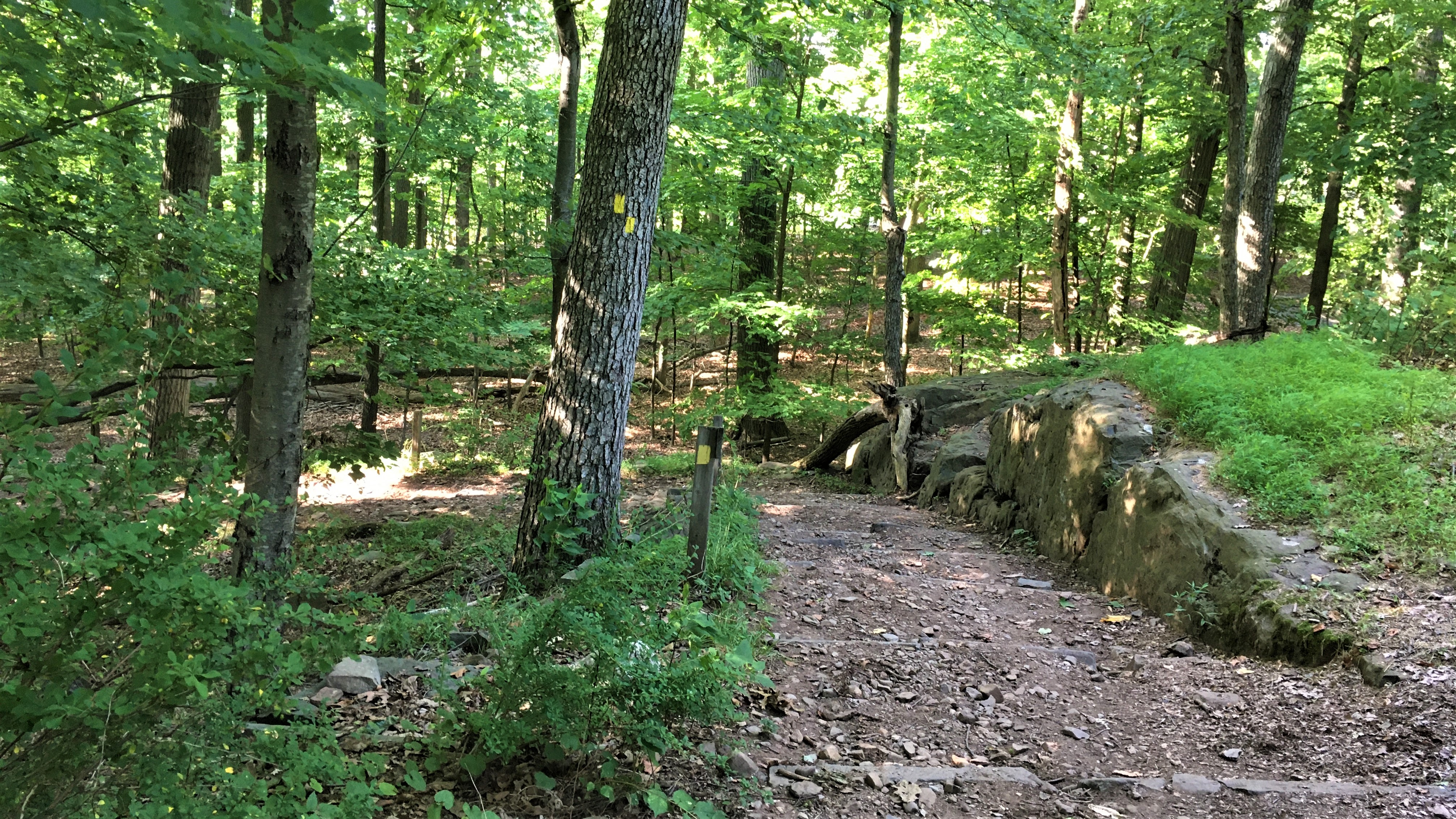 But I found a short, flat walk promising views of the city and wildflowers over in Eagle Rock Reservation, and we hopped in the car. It’s starts out along the Lenape Trail, a project named for the Leni Lenape people (meaning literally “Original People”) mostly forced out of New Jersey, build a hiking trail connecting Essex County’s major green spaces and historic sites. On Eagle Rock Reservation in Montclair, it’s a wide trail with some impressive protective stonework built in.