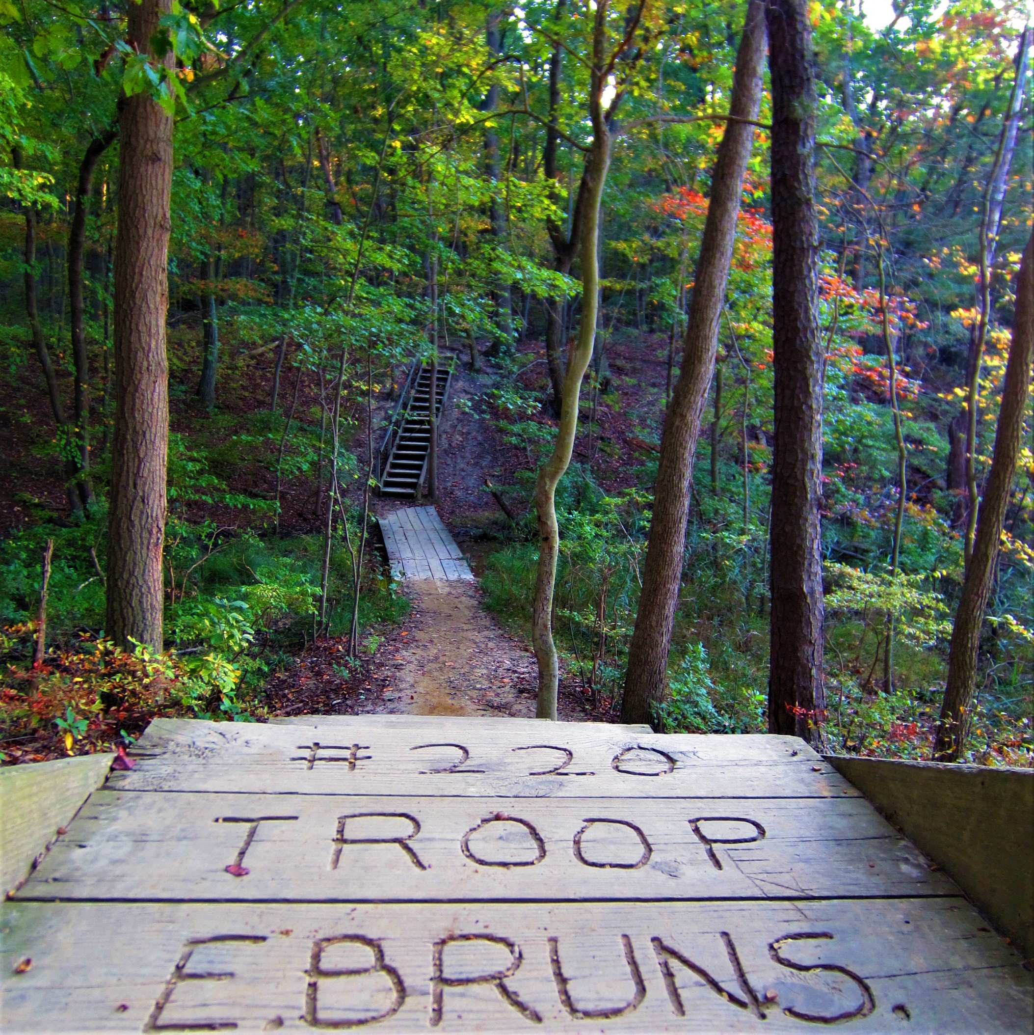 The trail climbs and dips, with the help of stairs, some constructed by local scouts, between hardwood forests on high ground, and swampy low grounds traversed by wooden boardwalks, and still a very sandy soil with plenty of moss.