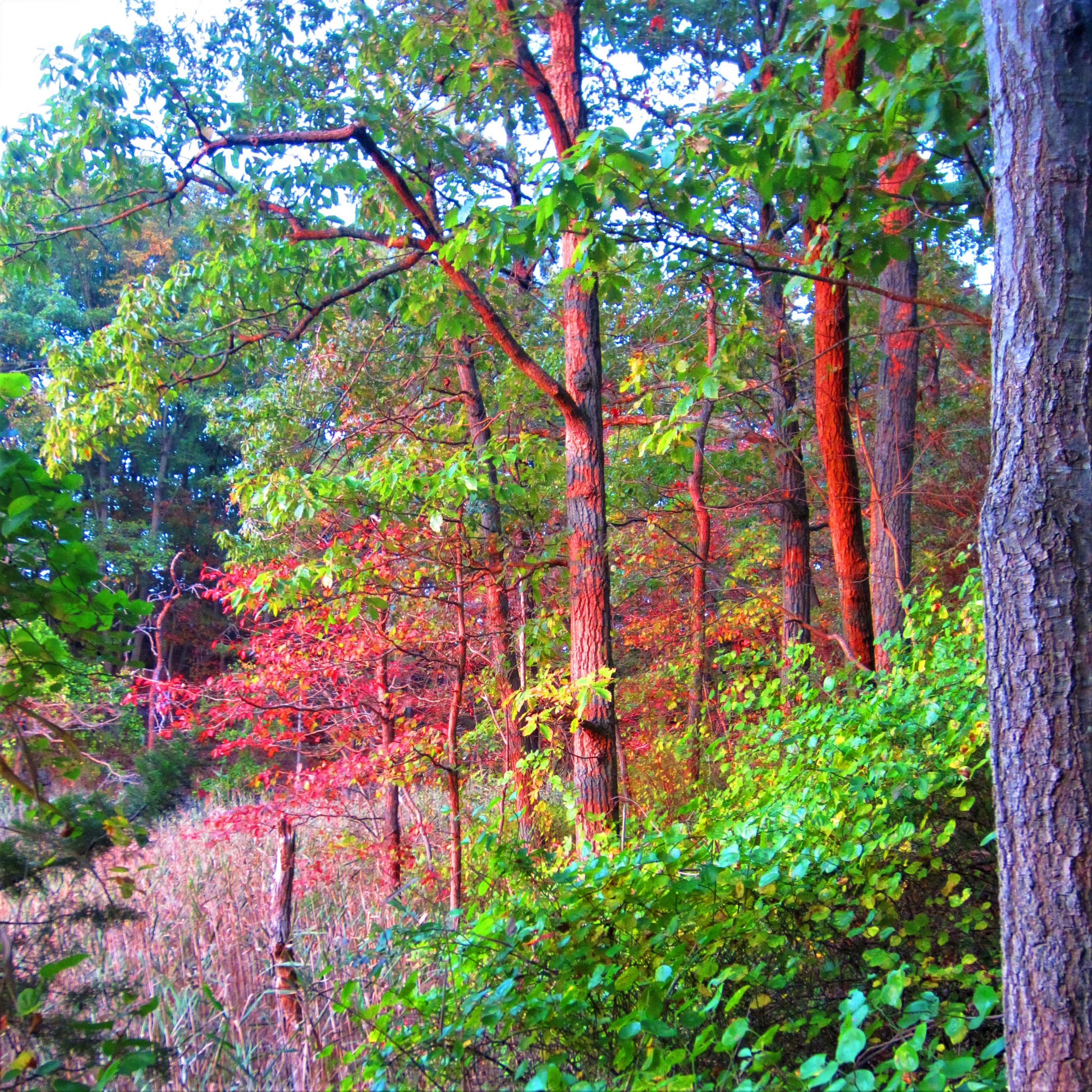 The first thing that struck me was how different this terrain is from what we’re used to farther north and west, more inland. The ground is very sandy in Cheesequake, with extensive carpets of moss in many places, and marshes just beyond the trees all along the Yellow Trail.