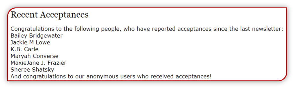There’s another section of the “Weekly Wire” that I particularly love. As a subscriber to the database, you can choose to be recognized in the newsletter for your recent acceptances. It comes at the very bottom of the newsletter, saving the best for last, and I always look there for names that I recognize.