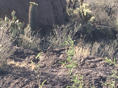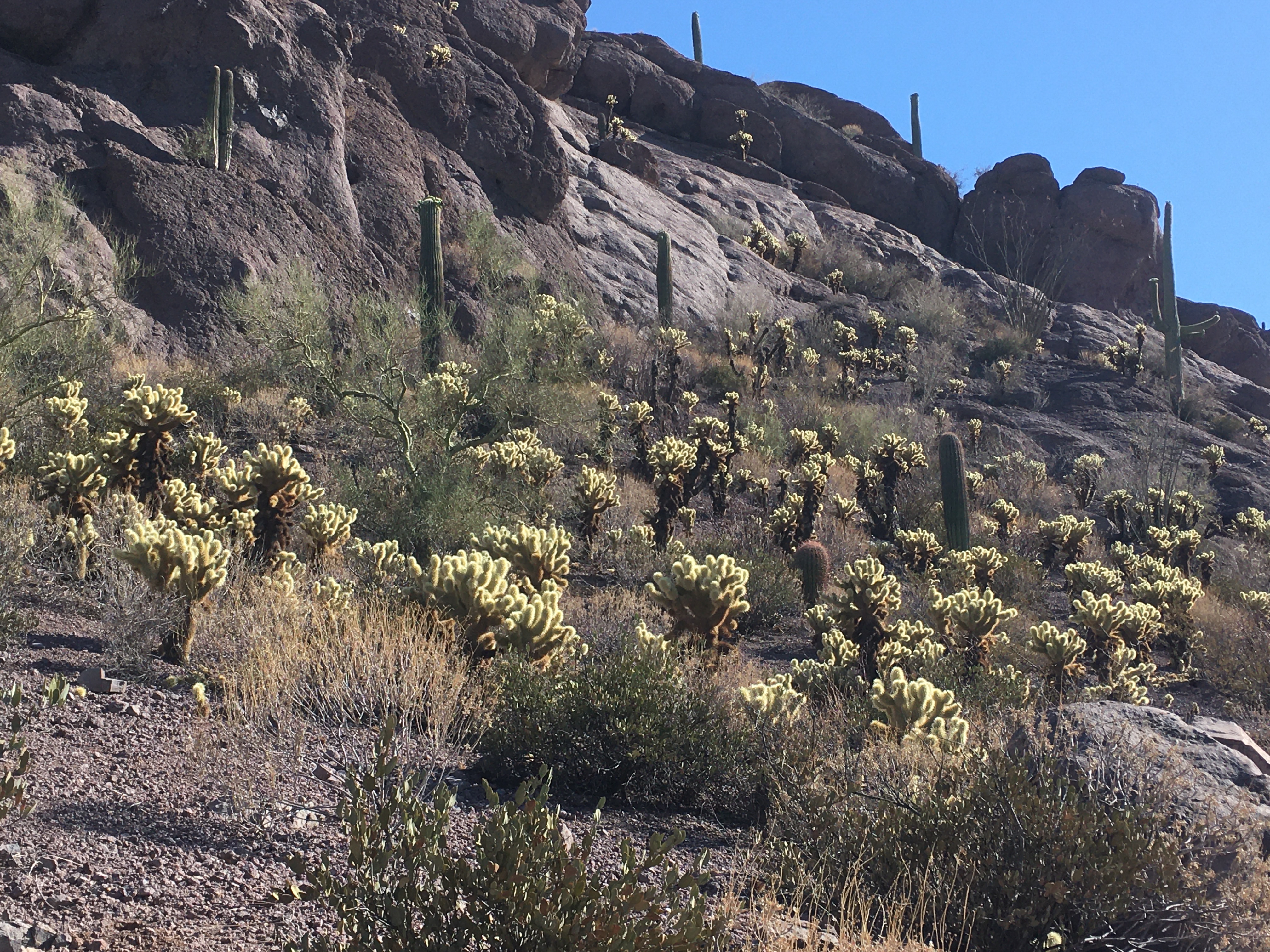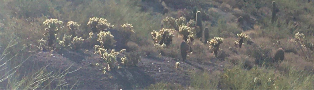 When walking in the desert, you have to be very careful of these jumping cholla, which bud off little pieces that roll down the hillside and catch on critters passing by, who carry them off to new ground. If you’re not careful, the needles can go right through the sole of your hiking boot!