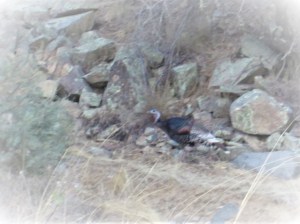 At the elbow of one particularly hairpin turn, down in a gully that ran under the road, we ran into this guy, strutting his stuff among the rocks, not terribly concerned about our presence, backing down the hill to grab a closer shot.