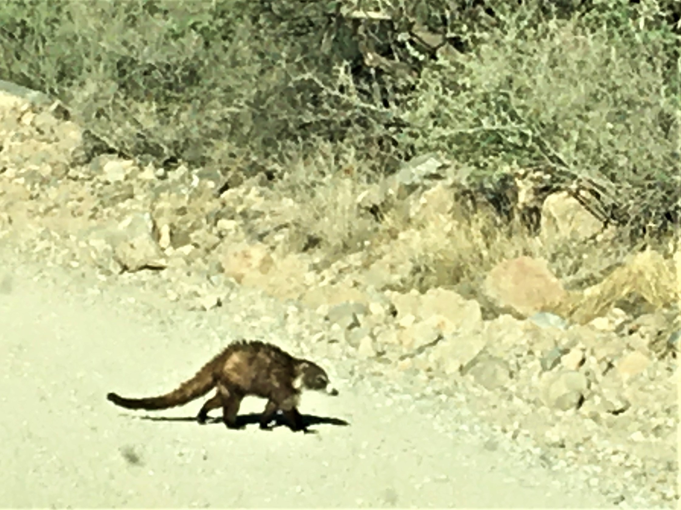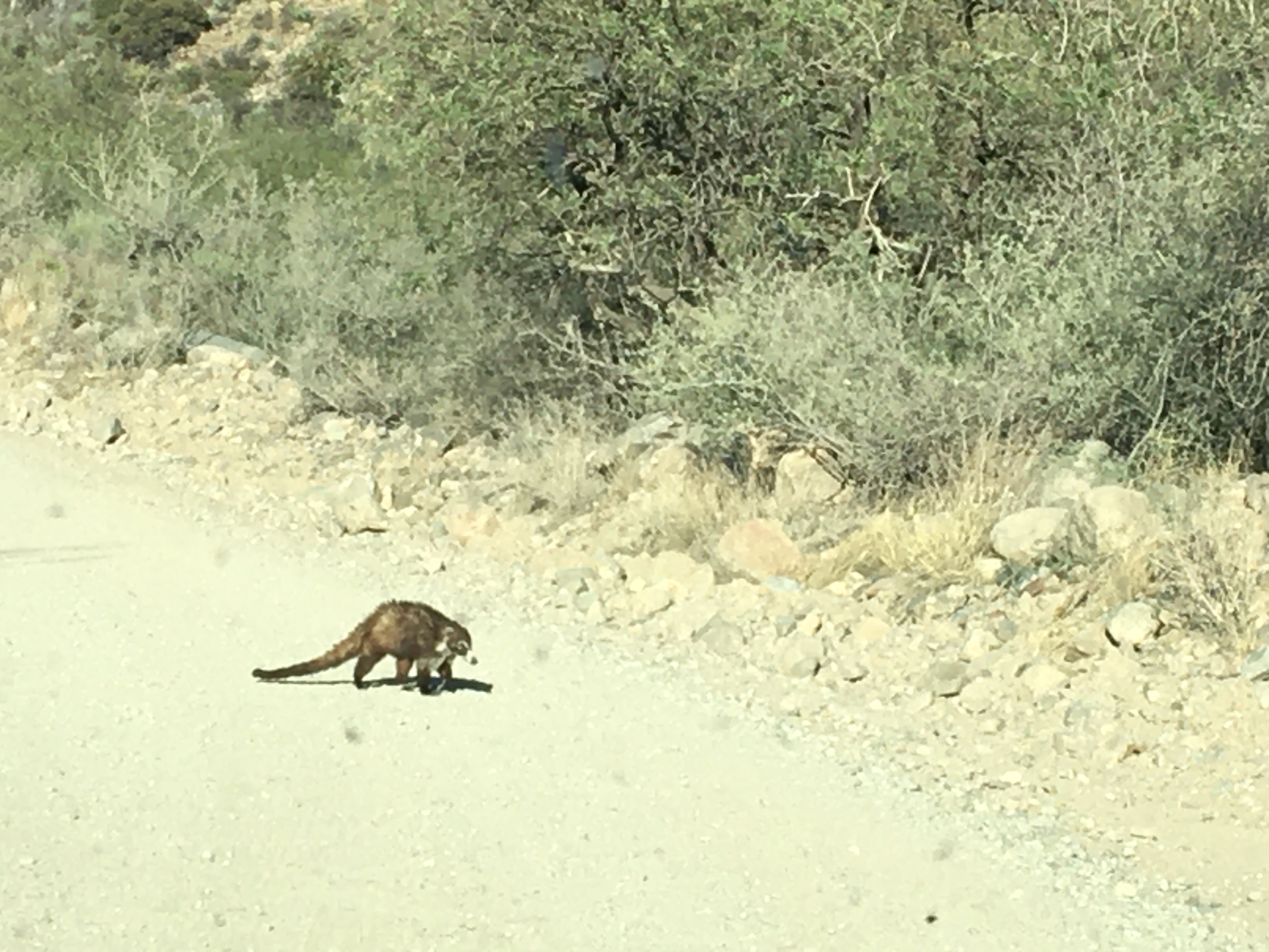 I’m pretty sure this little guy was a coati, sometimes also called a hog-nosed racoon, probably a male since he was definitely without a pack, and randy young guys apparently go rogue this time of year.