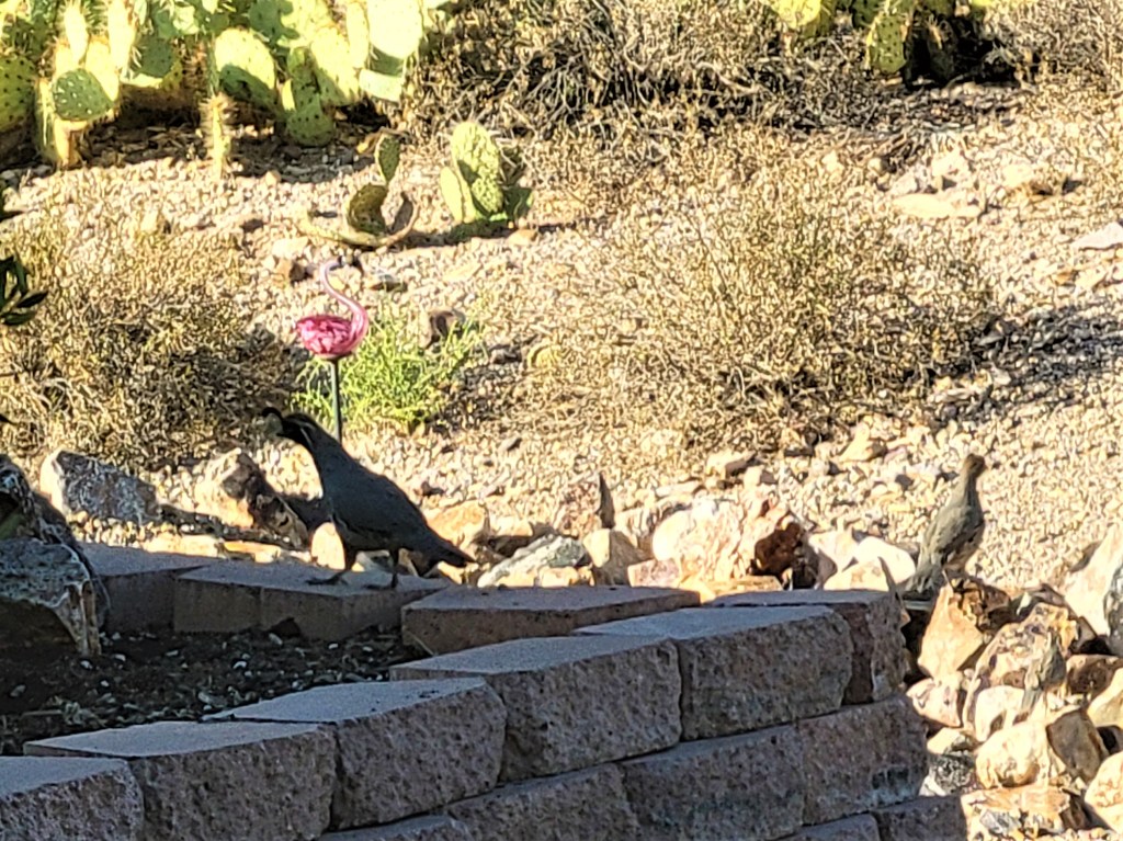 I also got a new phone with a vastly better camera, which has given me the opportunity to capture these Gambel quail with greater clarity from inside the house. They’re very skittish, incredibly difficult to get close enough for a really clear shot.
