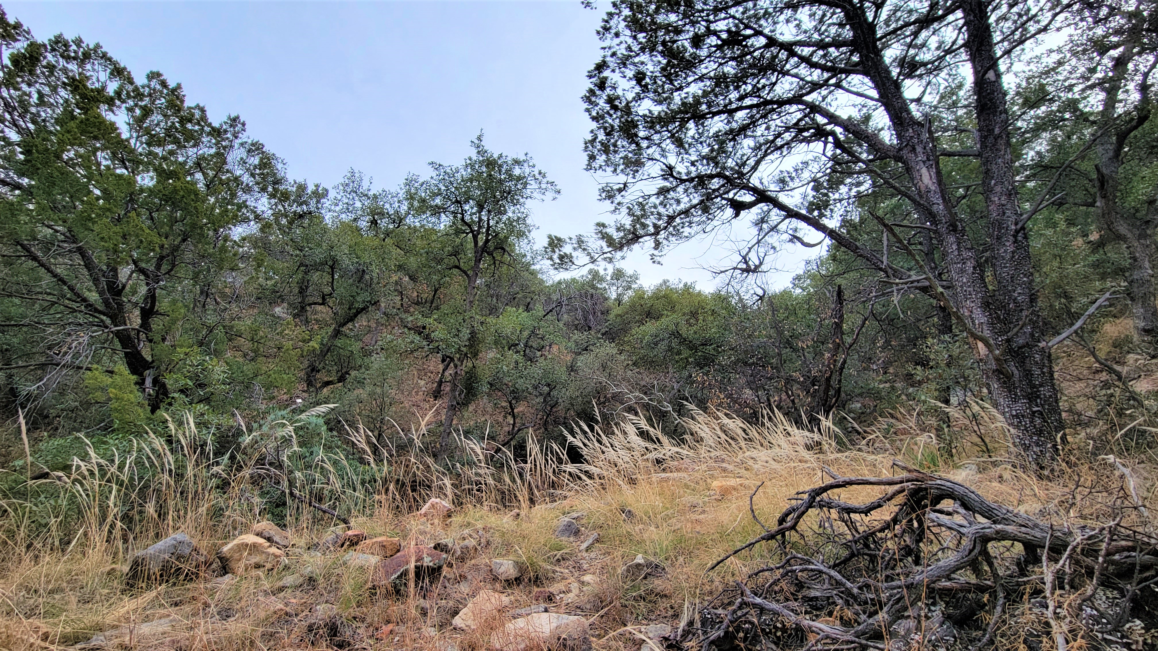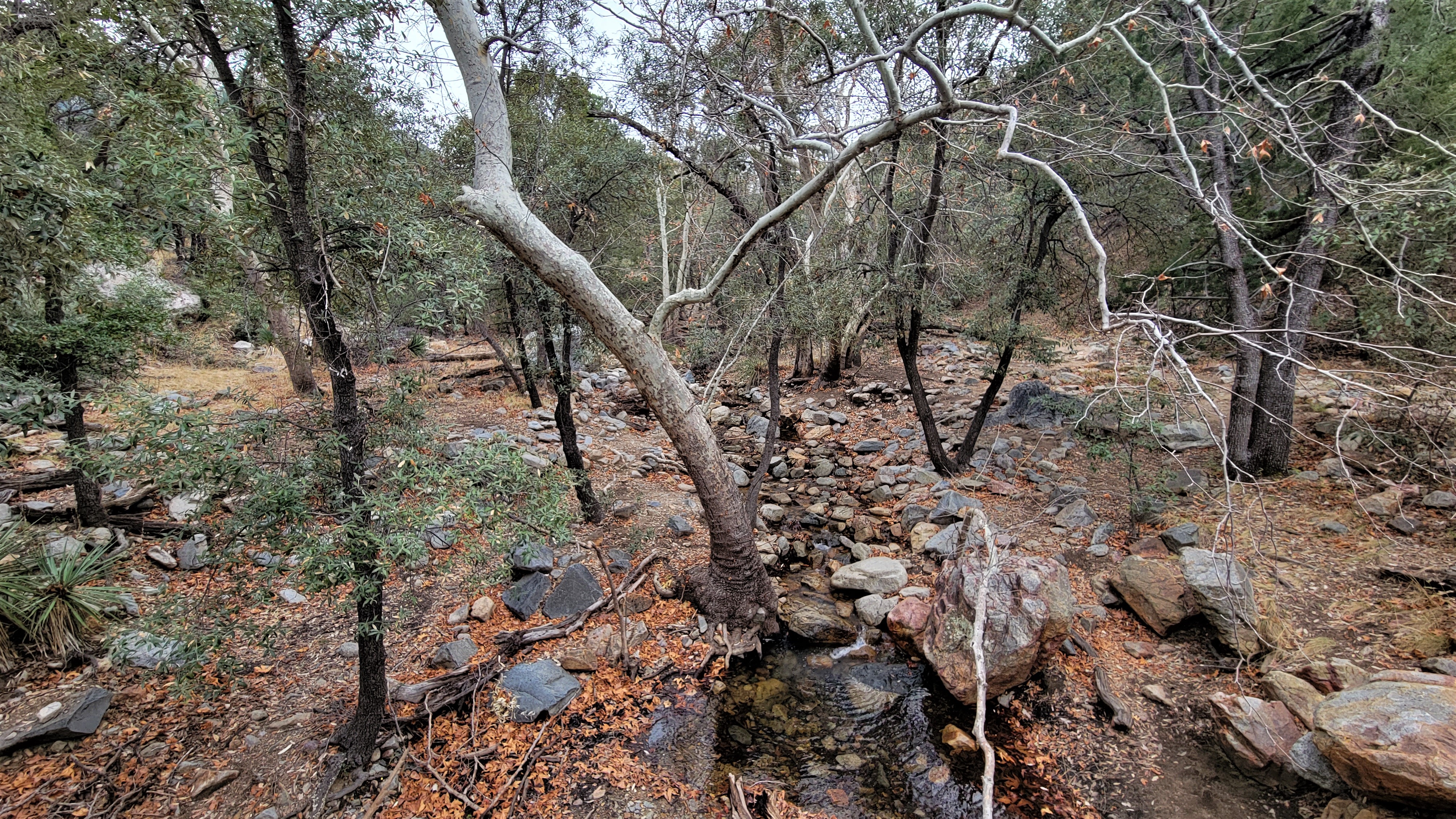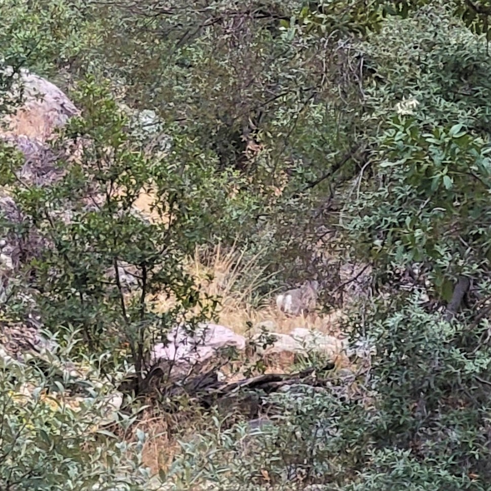 We started at the downhill end of the Nature Trail at the amphitheater, which is where we saw the butt ends of some white-tailed deer — the Coues’ white-tailed deer, a smaller subspecies mostly confined to Arizona and New Mexico’s southern mountains and across the border in Mexico. They were pretty skittish, bounding up the canyon parallel to the little stream, but I caught the flag end of one of them, if you can spot it.
