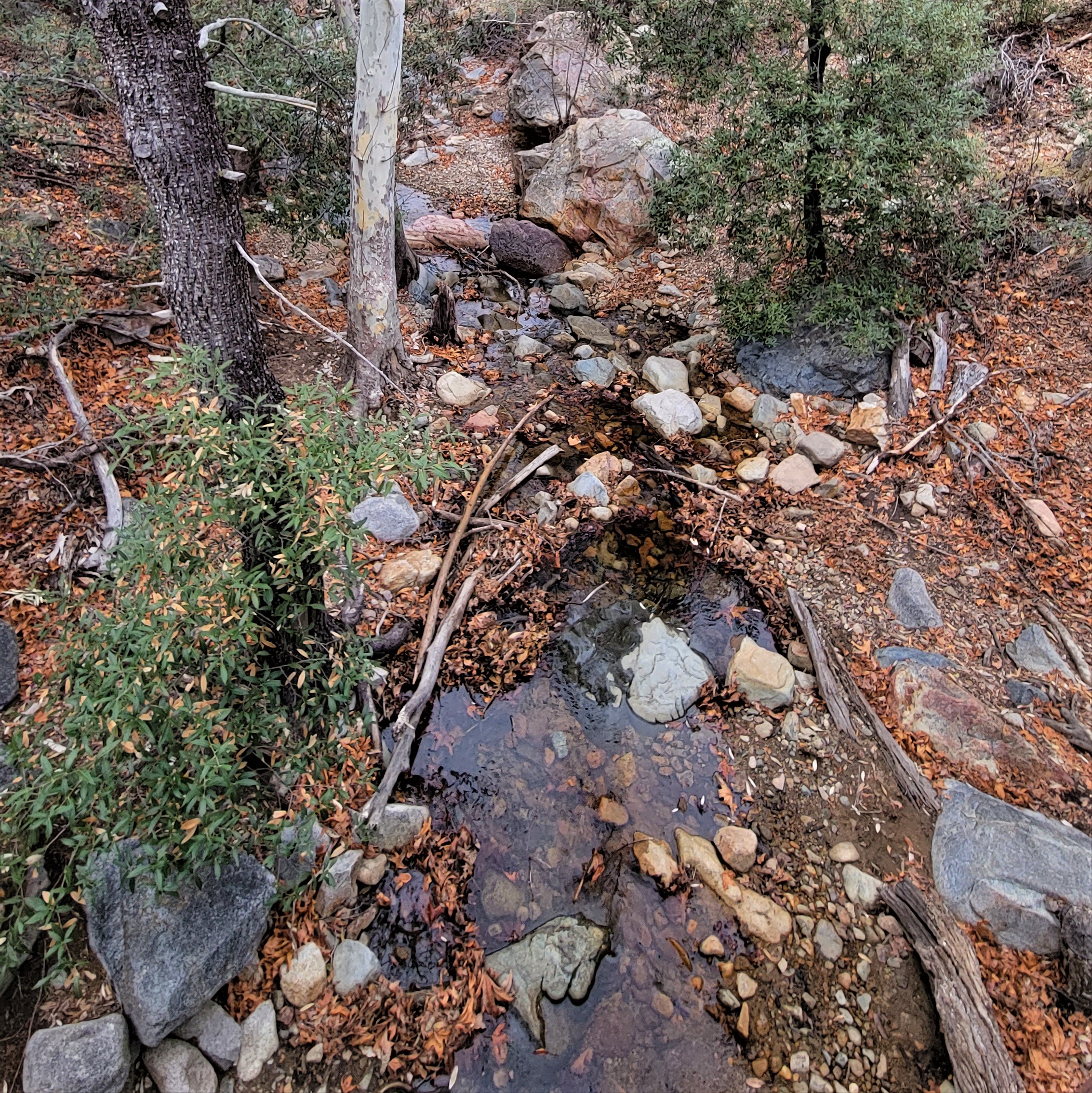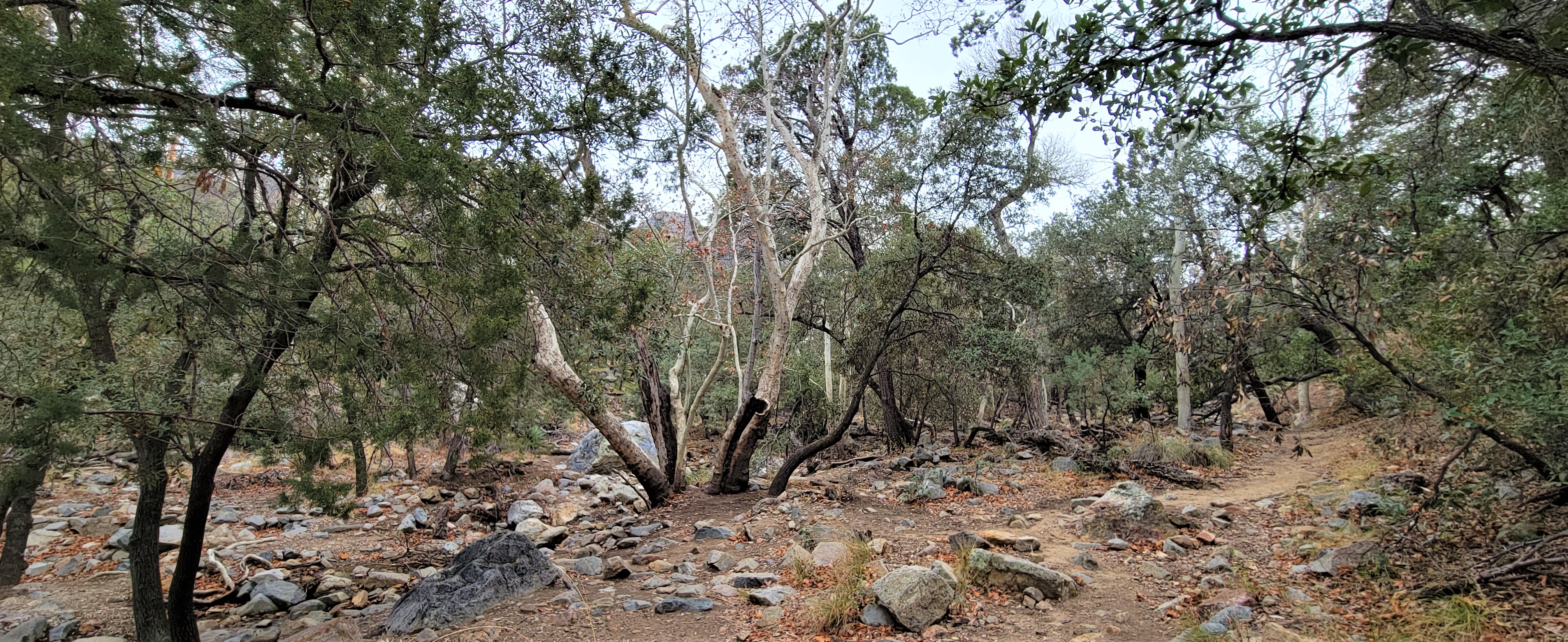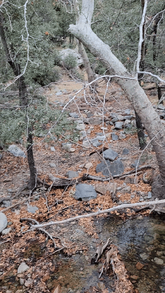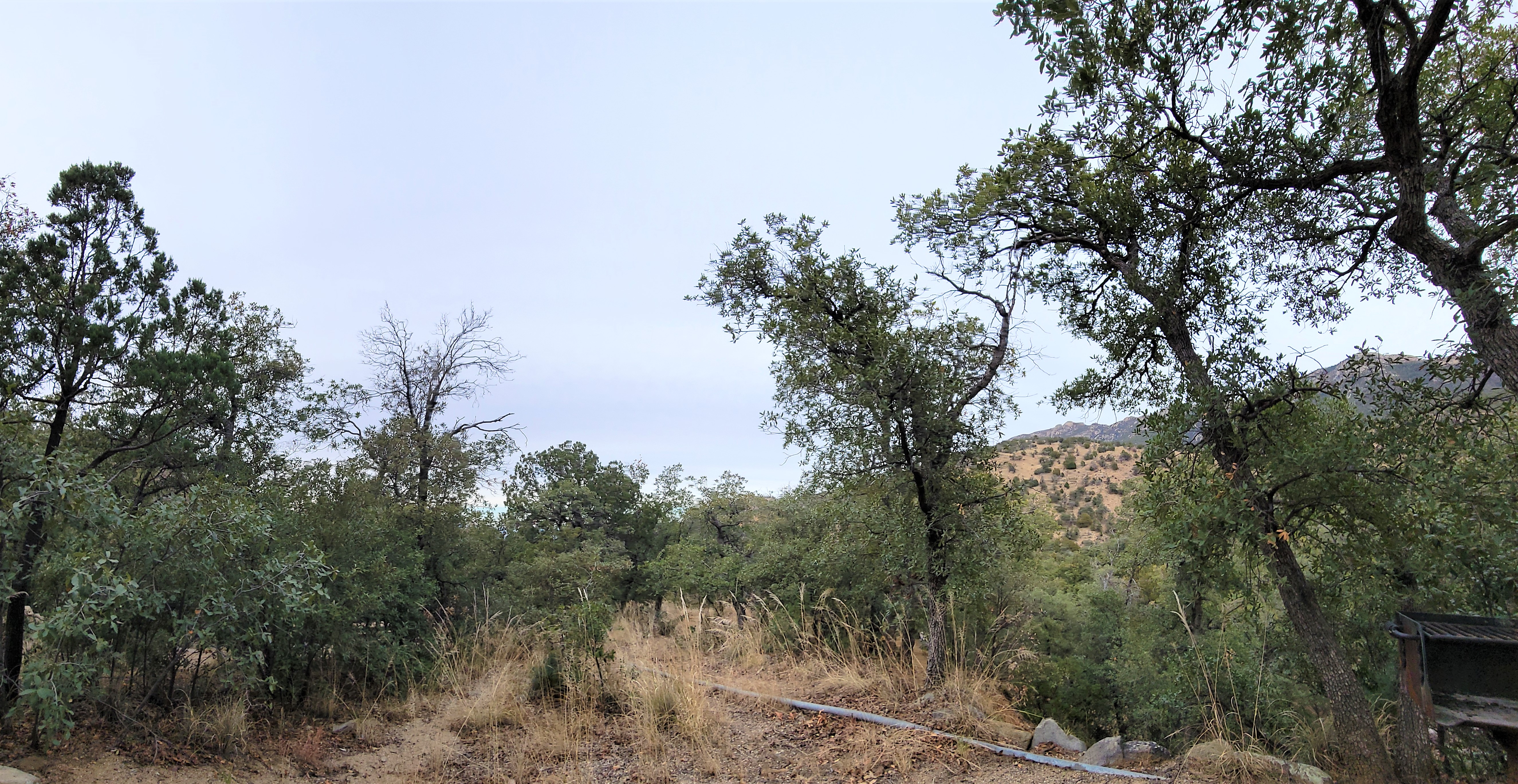 We started at the downhill end of the Nature Trail at the amphitheater, which is where we saw the butt ends of some white-tailed deer — the Coues’ white-tailed deer, a smaller subspecies mostly confined to Arizona and New Mexico’s southern mountains and across the border in Mexico. They were pretty skittish, bounding up the canyon parallel to the little stream, but I caught the flag end of one of them, if you can spot it.