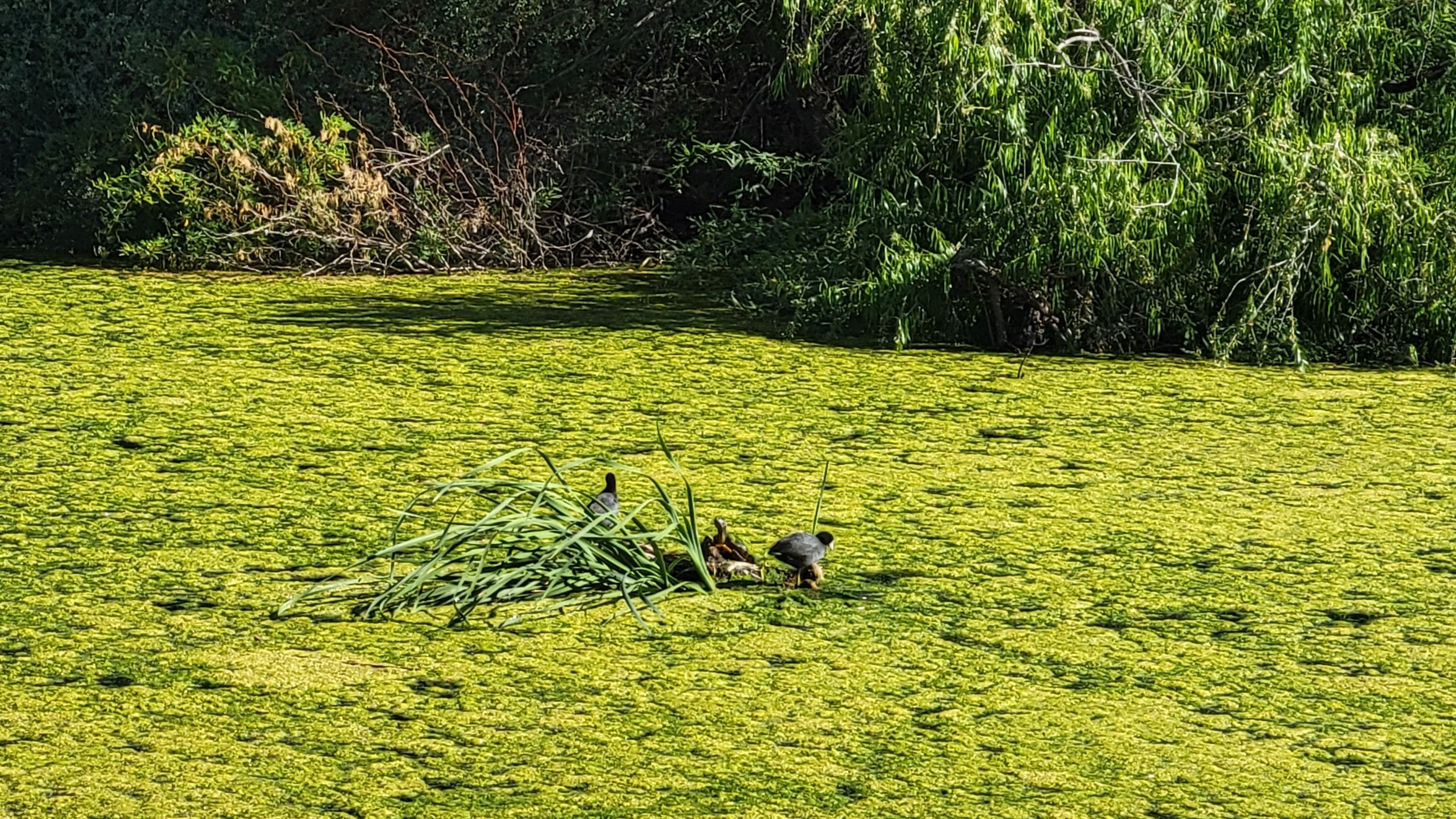 And later in the morning we saw some more coots with a turtle and that black-crowned night-heron lurking back left in the shadows.