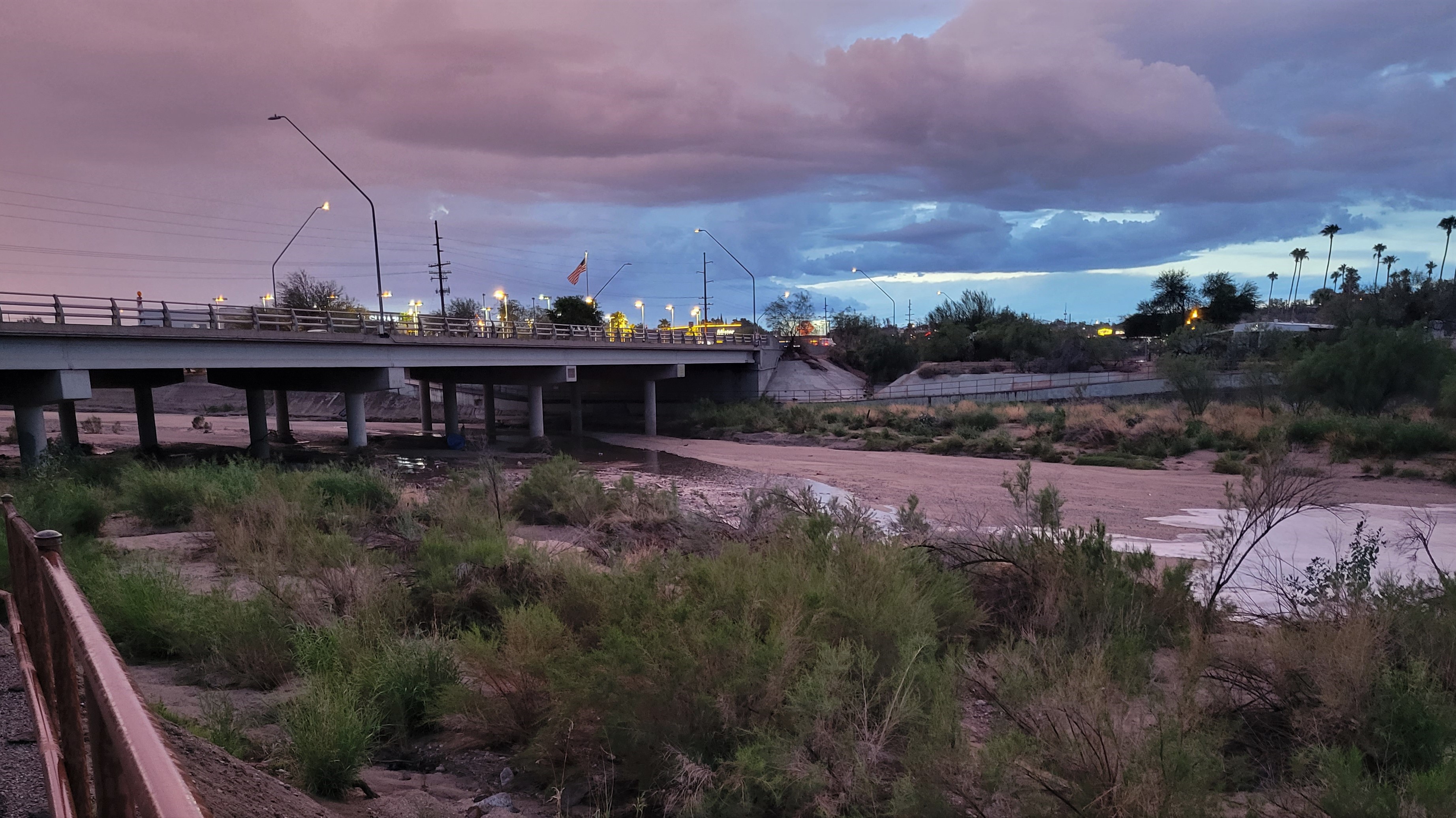 When we felt it was safe to emerge from under the bridge and return to the car, we headed downstream to the Tucson Mall, where we were able to watch the leading edge of the flood creep down the riverbed.